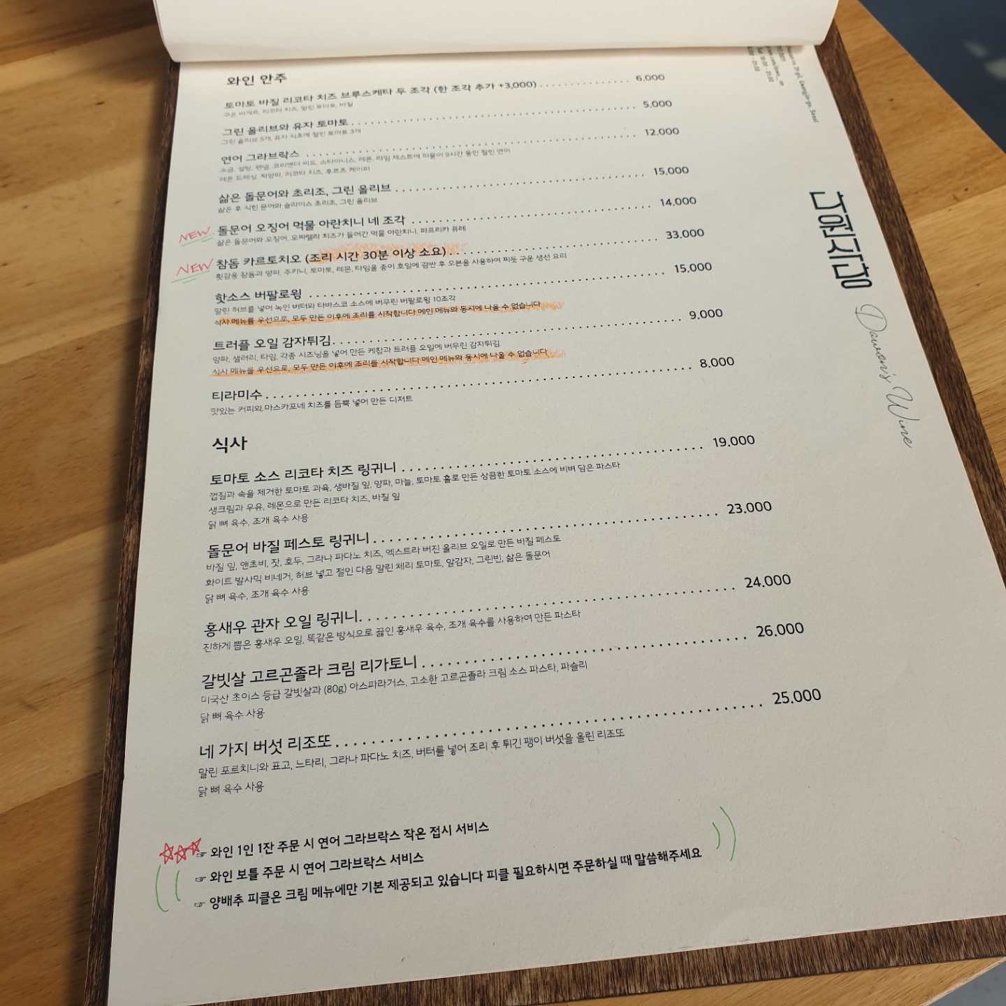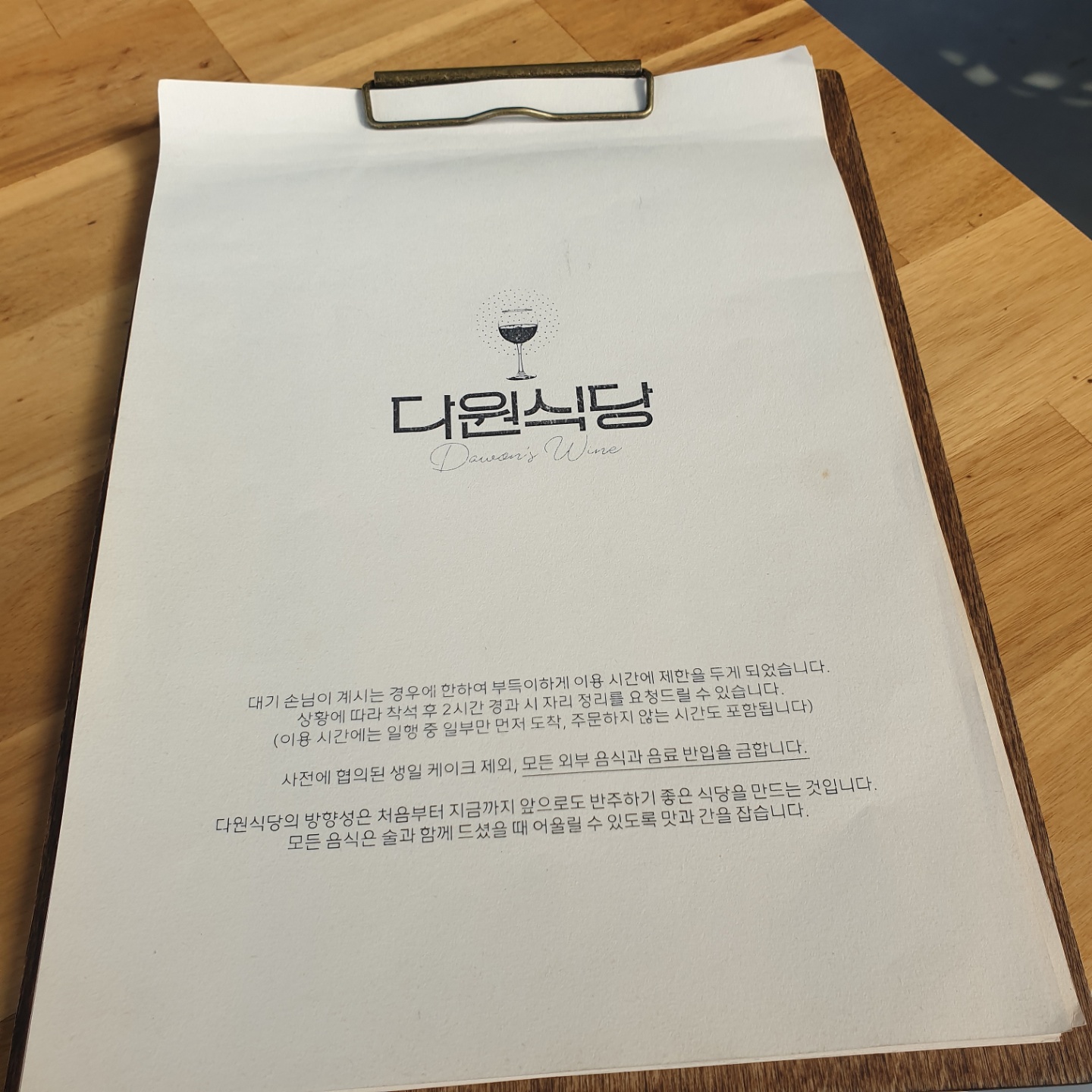 메뉴판에 있는 식당 소개글이 눈에 띄네요.