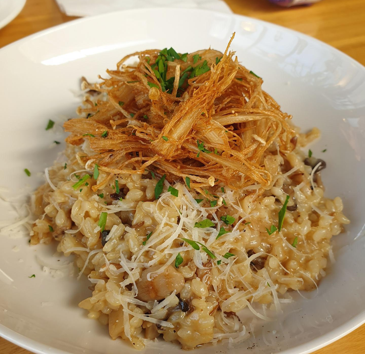 튀긴 팽이버섯이 토핑으로 올라가 있어서