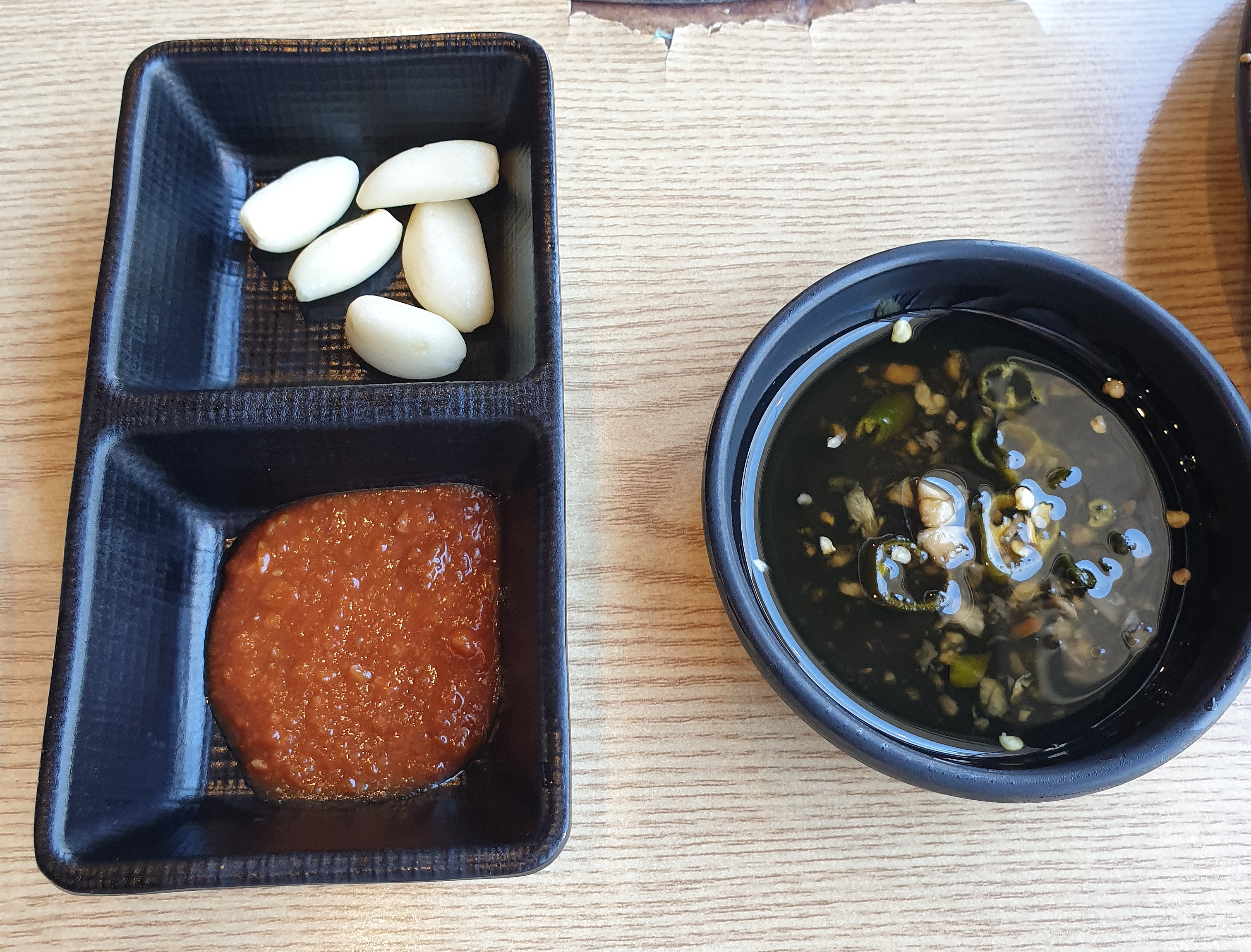쌈 채소, 쌈장, 마늘, 소스가 나왔어요.