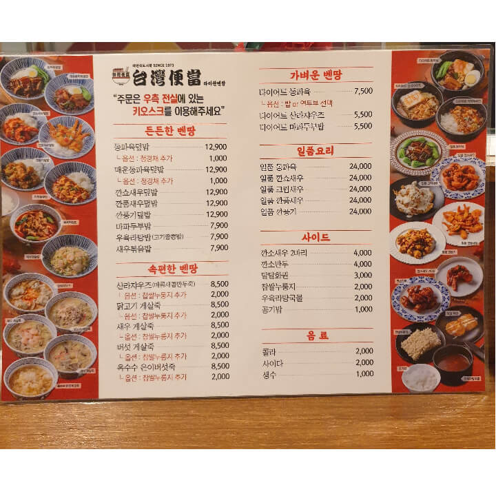 타이완벤땅의 메뉴입니다. 메뉴는 든든한 벤땅, 속편한 벤땅, 가벼운 벤땅, 일품요리, 사이드, 음료로 나뉘어 있습니다. 저희에게 가장 익숙한 메뉴는 동파육 덮밥, 마파두부밥, 새우볶음밥, 깐쇼새우, 깐풍기 등이 보이네요. 속편한 벤땅에 있는 산라쟈우즈, 닭고기 게살죽, 새우 게살죽, 옥수수 은이버섯은 듣기만 해도 상상이 잘 안 가는 메뉴라 쉽게 도전하기 어려울 수 있을 것 같아요. 산라쟈우즈는 매콤 새콤한 '산라' 맛 죽에 만두가 있는 음식입니다. 이건 중국 음식의 매콤 새콤한 맛을 잘 아시는 분들에게 추천드리고 이국적인 맛을 그렇게 좋아하지 않는다면 추천드리기 어려울 것 같아요. 중국은 아침에 죽을 먹는 문화가 있어서 타이완벤땅에도 죽 메뉴가 있나 봅니다. 간단하고 따뜻한 음식이 드시고 싶을 때 무난하게 먹을 수 있는 건 닭고기 게살죽, 새우 게살죽, 버섯 게살죽을 추천드립니다.