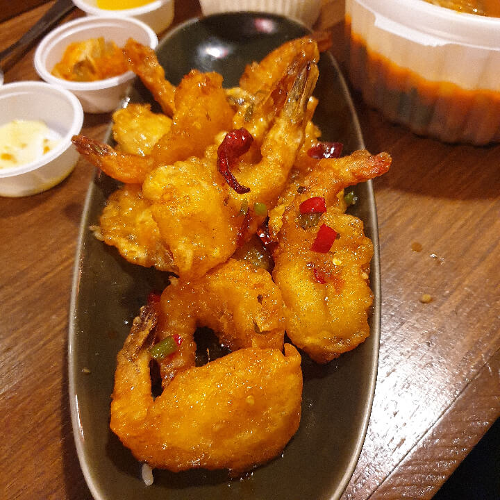 타이완벤땅의 일품요리, 가장 비싼 메뉴이기도 한 깐풍새우가 맨 마지막에 나왔습니다. 처음 딱 받았을 때 느낌은 28,000원에 비해 양이 적은 느낌이었어요. 맛은 깐풍기 소스와 같은 간장 마늘 소스에 매콤한 고추가 매운맛을 중간중간 내주었습니다. 튀김도 바삭하고 소스와 잘 어울려서 만족스러웠습니다.