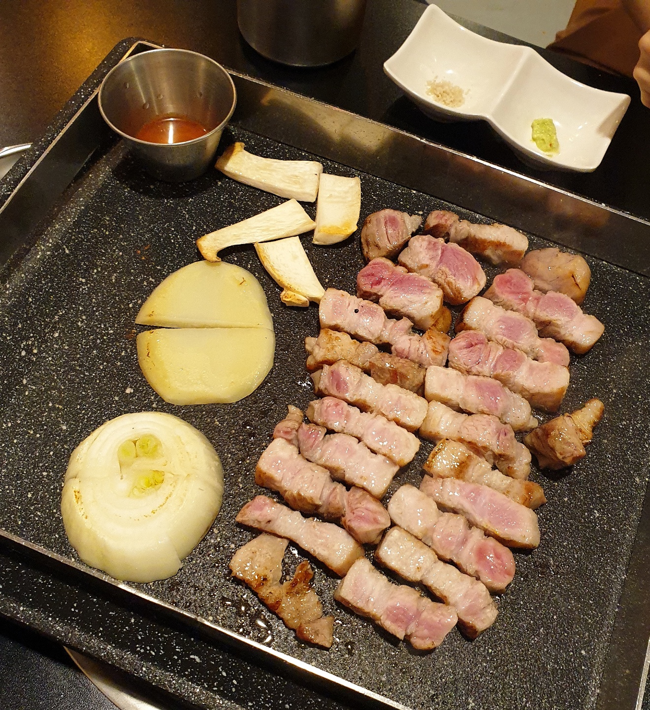 양파, 감자, 버섯과 소스까지 올려주셨어요.